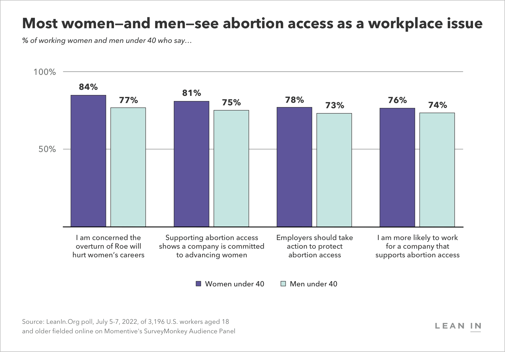- 74% of working men under age 40 are more likely to want to work for a company that supports access to abortion, and 73% think their employer should take action to protect abortion access in response to the Supreme Court decision overturning Roe.